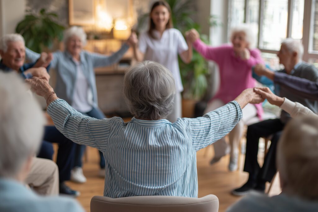 Daily routines and community activities focused on physical health, mental engagement, and social connection, helping residents stay active and involved.